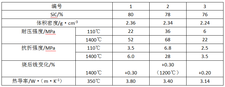 表1-1為高熱導(dǎo)率耐火澆注料的性能。SiC骨料的顆粒級(jí)配為5-3mm,11%;3~1mm,49%;1~0.15mm,40%;耐火粉料為SiC微粉,其細(xì)度為0.043mm(325目)。采用鋁酸鹽水泥作結(jié)合劑,并摻加減水劑、早強(qiáng)劑和膨脹劑等復(fù)合外加劑。耐火骨料和粉料之質(zhì)量比為70:30。