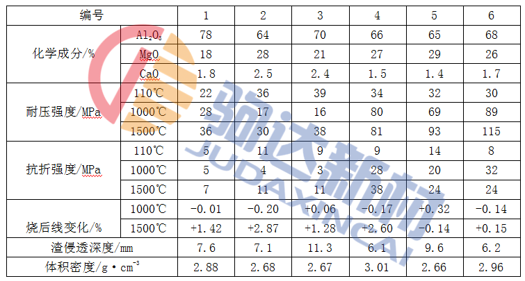 高純鎂鋁(鋁鎂)質(zhì)耐火澆注料的性能,見(jiàn)表1-1。耐火骨料臨界粒徑為8mm或5mm。編號(hào)1~編號(hào)4用的耐火骨料為MgO97%的電熔鎂砂,用量為65%,耐火粉料也為電熔鎂砂粉,用量為21.5%;編號(hào)1用的電熔剛玉粉小于0.088mm的為10.5%、超微粉為3%;編號(hào)2~編號(hào)4用的電熔剛玉粉小于0.088mm的8.5%,編號(hào)2用其超微粉5%。編號(hào)3和編號(hào)4則用α-Al2O3超微粉5%。剛玉和α-Al2O3超微粉的比表面積分別為26m2/g和36m2/g;編號(hào)5用的骨料為致密白剛玉,白剛玉和α-Al2O3作耐火粉料,同時(shí)添加5%的高純燒結(jié)鎂砂(MgO97.6%)粉;編號(hào)6用的耐火骨料為Al2O390%的特級(jí)礬土熟料34%、高純電熔鎂砂粉30%和鋁鎂尖晶石4%。耐火粉料為剛玉粉和MA粉、α-Al2O3和SiO2超微粉。結(jié)合劑為CA-80水泥,并摻加適量外加劑;編號(hào)1~編號(hào)5用的結(jié)合劑為CA-70水泥,其用量約為4%。按材料配合比要求,加減水劑0.15%,水用量為5%~6.5%,成型制樣,自然養(yǎng)護(hù)。養(yǎng)護(hù)3d后檢驗(yàn)常溫耐壓強(qiáng)度,一般為6~16MPa。