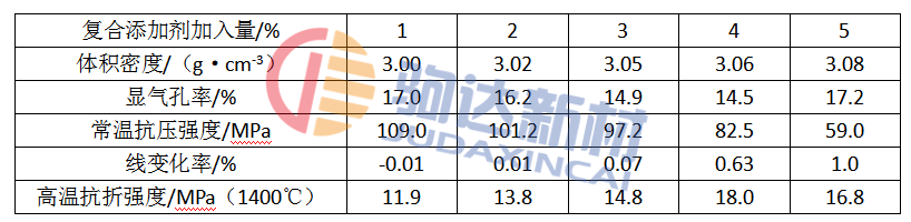 表2 復合添加劑對1500℃3h燒后澆注料性能的影響