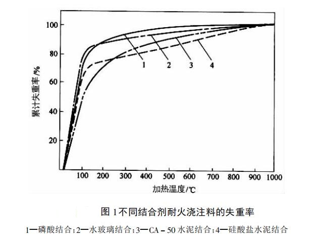 圖1為不同結合劑耐火澆注料的失重率。從圖中看出,110℃烘干后的失重率為55%~80%,在200~300℃的溫度范圍內,累計失重率一般達到70%~90%。這說明,低溫階段脫水是比較多的,主要是游離水,還有部分結合水;隨著溫度的繼續升高,結合水和結晶水則不斷排除。達到500℃時,澆注料含水率僅為10%左右。同時看出,耐火澆注料品種的不同,各溫度下的失重率略有區別。因此,烘爐曲線的制定,也有所差異。