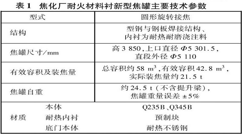 耐火材料襯新型焦罐是在不改變原傳統合金襯板焦罐外形尺寸的前提下,采用耐火材料替代原合金襯板,用整圈鋼板替代原有框架結構的技術。它的特點是根據罐體不同部位的工況采用不同材質的耐火材料內襯和不同的施工工藝。新型焦罐主要技術參數見表1