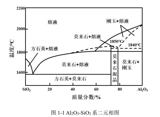 耐火澆注料是由一定級配的骨料、細(xì)粉、結(jié)合劑和外加劑按一定比例組成的耐火混合料,因其具有生產(chǎn)工藝簡單、生產(chǎn)周期較短、節(jié)能等優(yōu)點被廣泛使用。 高鋁系列耐火澆注料是由 Al2O3和SiO2作為基本化學(xué)組成的耐火澆注料。高鋁系列耐火澆注料的相組成可以從 Al2O3-SiO2 系相圖得到。從圖1-1可以看出,Al2O3的熔點為2050 ℃,SiO2的熔點為1723 ℃。在該系統(tǒng)中,唯一穩(wěn)定的二元化合物為莫來石,其化學(xué)組成為3Al2O3·2SiO2(Al2O3為71.8%,SiO2為28.2%),莫來石的熔點為1850 ℃。由于莫來石的存在,系統(tǒng)被劃分為兩個子系統(tǒng):SiO2-莫來石子系統(tǒng),固化溫度為1595 ℃,共晶點組成接近SiO2一側(cè),以及Al2O3-莫來石子系統(tǒng),固化溫度為1840 ℃,共晶點組成接近Al2O3一側(cè)。